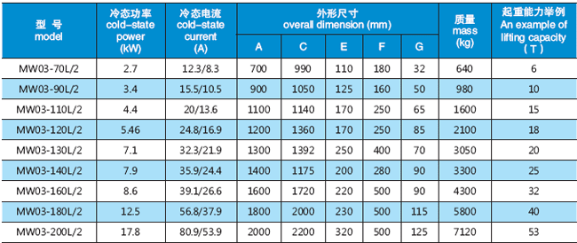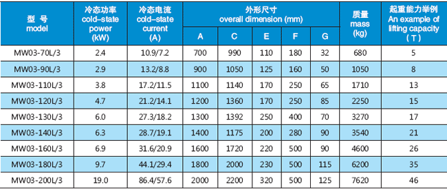 Main technical data (rated voltage DC-220V, duty cycle TD=60%, steel temperature: below 150°C)