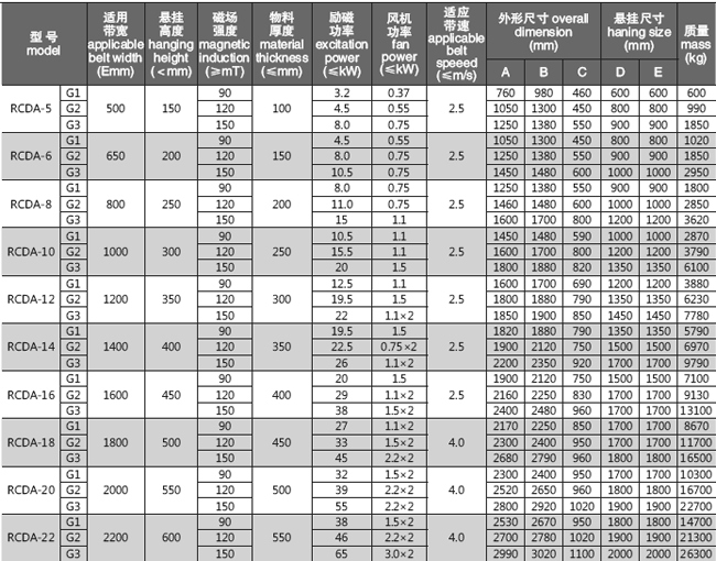 RCDA-G Fan cooling Type Super-strong Electromagnetic Separator uses air-conditioner inside the separator to cool down, featuring easy operation, and so on and are suitable for working in good working conditions. They remove iron from materials in the crusher or on the conveyer belt and can protect mechanical equipments like roll, crusher and muller.